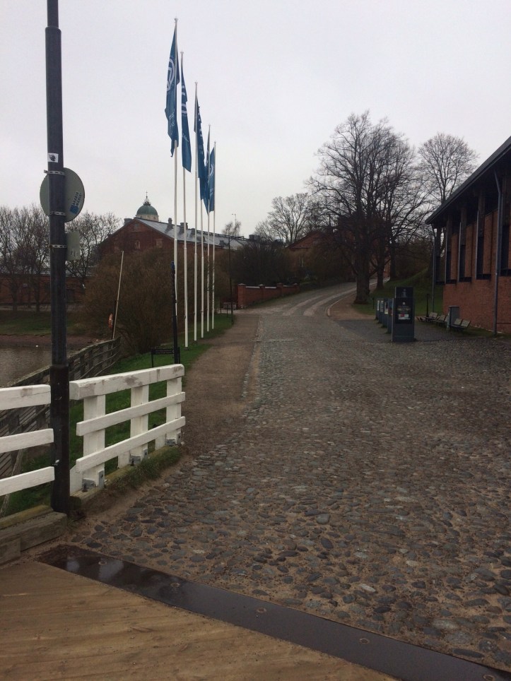 Ennusteen mukainen sade on toteutunut melkein kellontarkasti. Aamulla koirat pääsivät lenkillä hyvin kevyessä pienessä tihkussa. Aamuinen Suomenlinna ei kovin vilkas ollut, mutta pääsimme jopa seuraamaan Uusimaan lipunnostoa. Merivoimat hoitaa asian sekunnin tarkkuudella. Aamiaisen jälkeen ne jäivät kuitenkin ihan tyytyväisenä veneeseen kun lähdimme kaupungille.