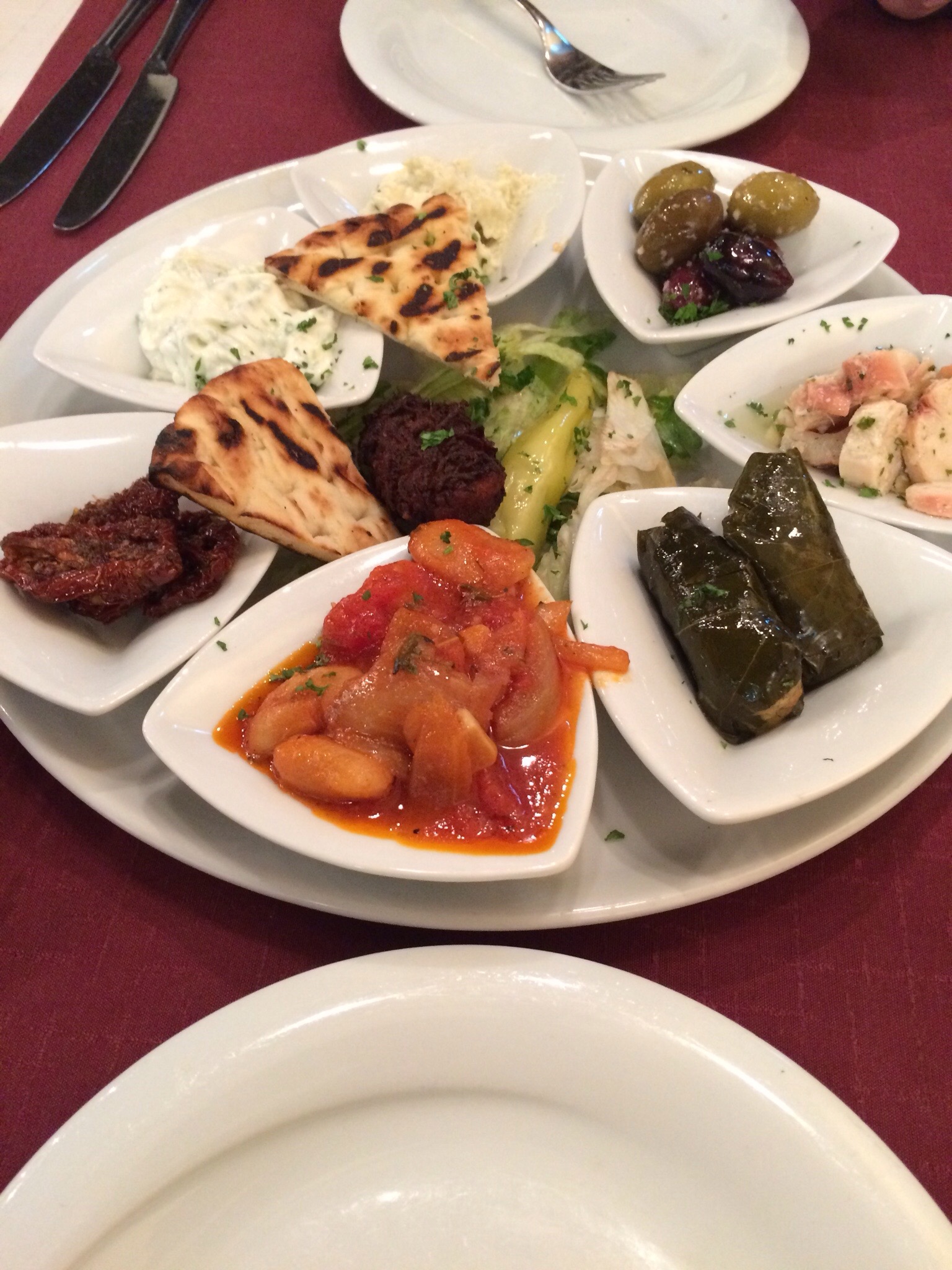 Paluumatkalla kaupunkiin nälkä oli jo yltynyt valtavaksi. Kipparin himo oli tällä kertaa välimerellinen, ja onneksi Kampista löytyy ravintola Minos. Pieni alkupalalautanen tzazikilla, oliivilehtikääryleillä ja halloumijuustolla taltutti pahimman nälän. Kun vielä sekalaiset grillilihat, vihannekset ja perunat oli tuotu pöytään oli yltäkylläisyys taattu. Jälkiruuaksi jaksoimme enää vain kahvit.